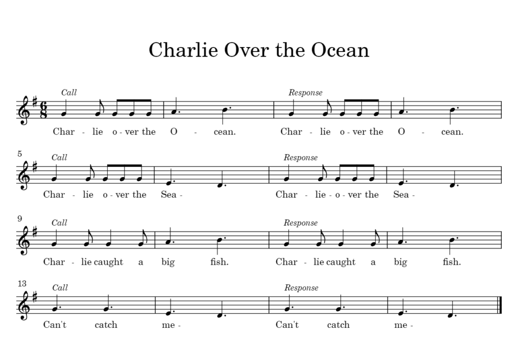 Charlie Over the Ocean is a game similar to Bee Bee Bumblebee. The leader walks around the circle and uses one of the four voices. The class repeats using the same voice. Charlie Over the Ocean is my go-to for assessing since it incorporates solo singing. I will choose the voice that I want the student outside of the circle to use. When the game first begins, I only choose one voice; as the game progresses I add more voices until they are using a different voice for each line of the song. I use visuals like these to show them which voice they will perform for each line.