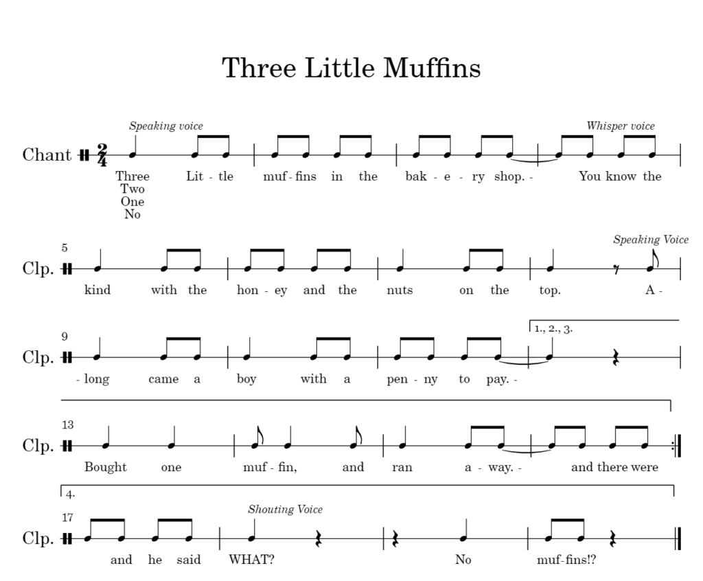 Three Little Muffins is a song I use when I’m assessing student understanding of the four voices. This song only uses the whisper, talking, and shouting voice. When we finish with the chant I like to have students identify the voice that they didn’t hear. They should be able to recognize that they didn’t hear the singing voice. I also like to use this song to transition into discussions about appropriate places for using each voice. I start by asking students, “What type of voice can we use in the bakery.” or “What happens if we use our shouting voice in the bakery?”. From there we discuss other locations.