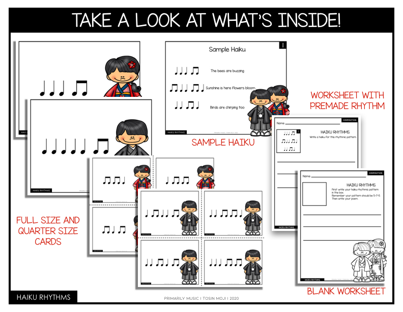 This product comes with flashcards of 5 beat rhythms and 7 beat rhythms. Consider using these when we get back into the classroom. You can use these flashcards to randomly assign scholars a rhythm, put them in groups of 3 and they will create a haiku using the rhythm they have. The possibilities for these haiku cards are endless but that’s just one idea! I’m sure you can even find ways to use these cards for distance learning!