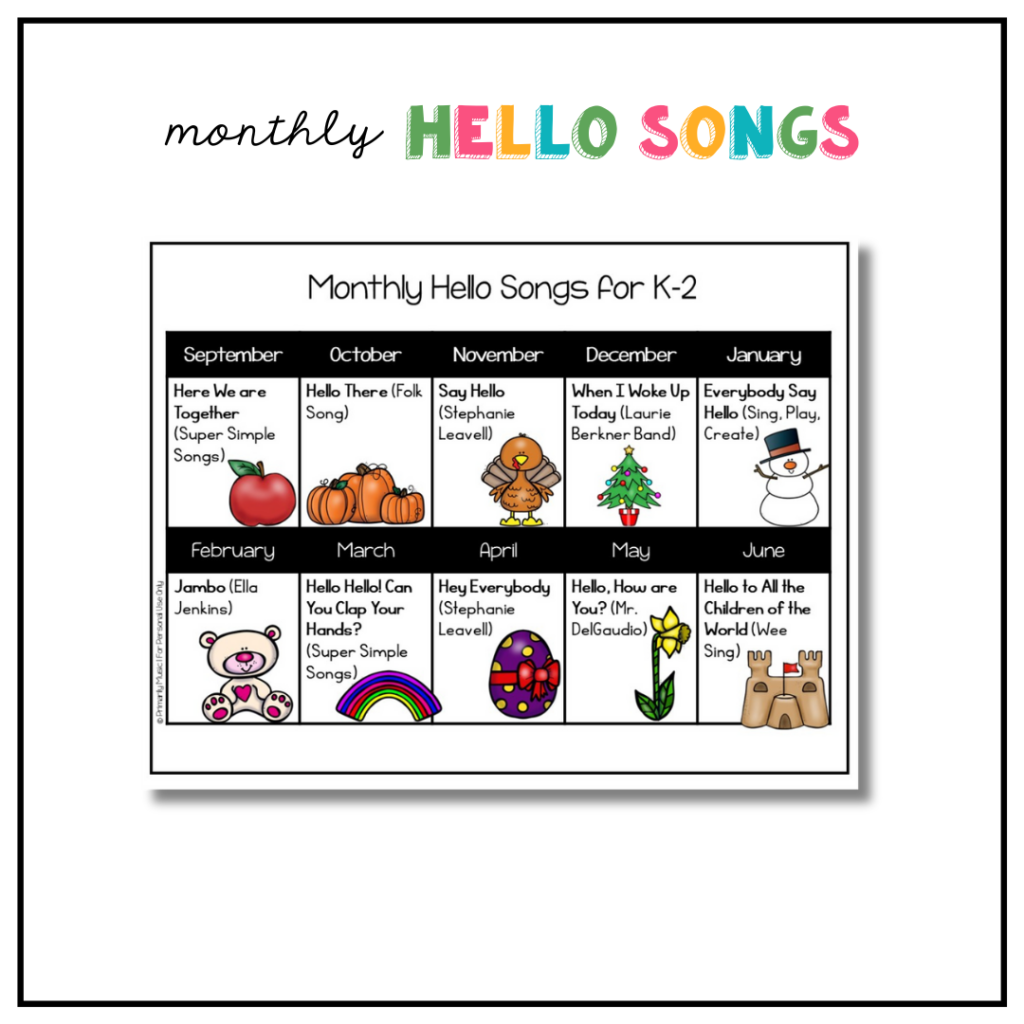 I do a hello song with my 2nd graders. It’s usually the last grade I do hello songs with, but do what works best for your student community. My monthly hello song playlist is below.