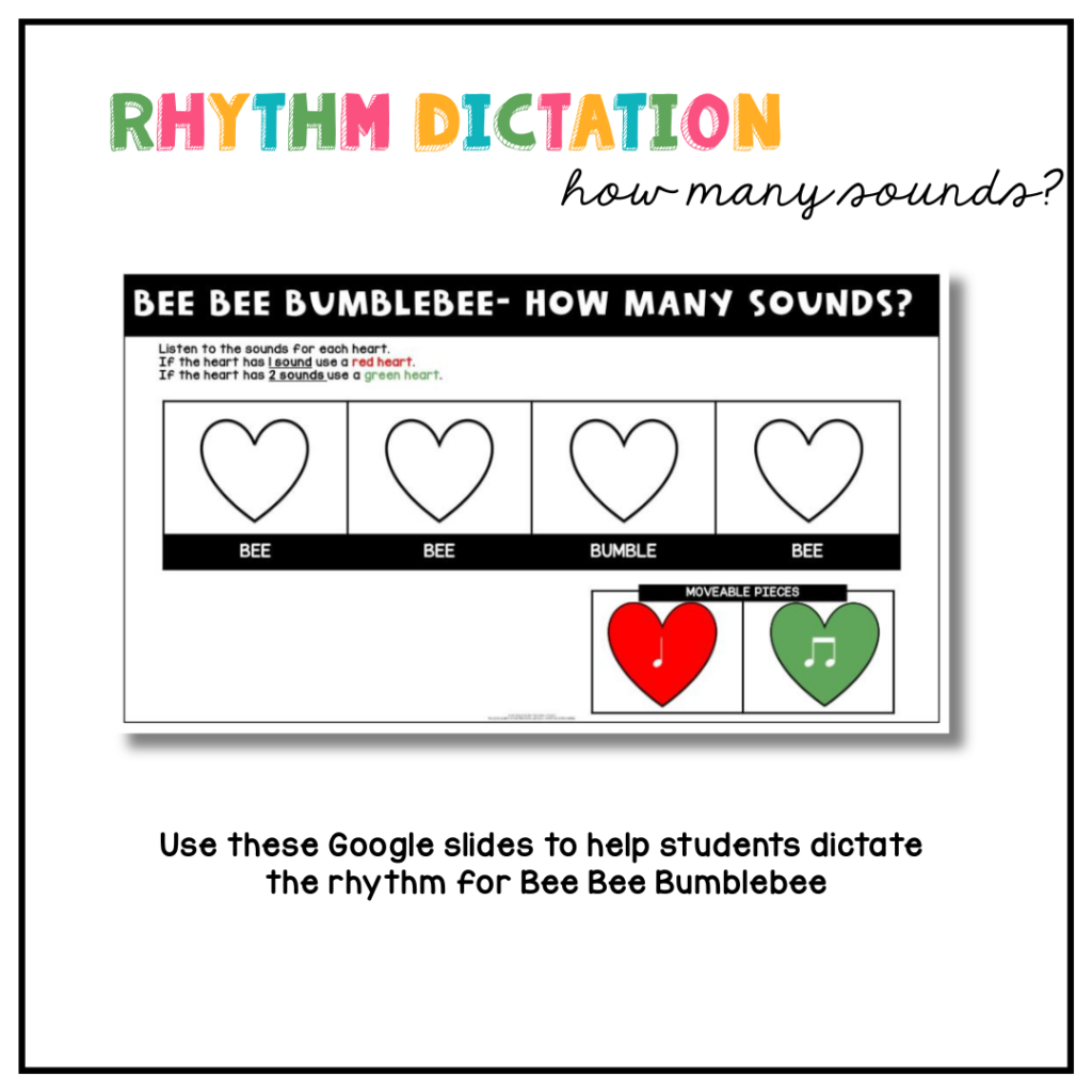 You can also use this song to review sol/mi and quarter notes/eighth notes. I put together this rhythm dictation Google Slides so students have a clear visual to guide them as they notate the rhythm for the song.